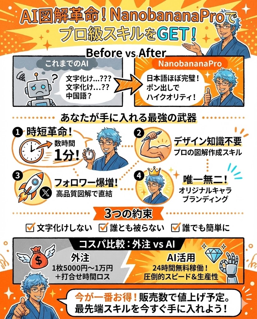 NanobananaProは図解をゼロから学ぶための教材というより既に発信している人のアウトプットを一気にレベルアップさせる「ブースター」のようなツールです。
